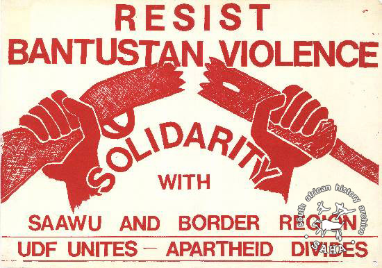 Resist Bantustan violence: Solidarity with SAAWUand Border region:UDF unites-Apartheid divides. |