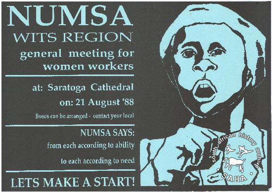 This poster is an offset litho in blue and black, produced by NUMSA, Johannesburg. This poster advertises a general meeting for women workers. The text reads: "NUMSA : WITS REGION : general meeting for : women workers : at: Saratoga Cathedral : on: 21 August '88 : Buses can be arranged - contact your local : NUMSA SAYS: : from each according to ability : to each according to need : LETS MAKE A START!". Digitised by Specialised Archival Solutions in 2009. Reproduced in "Images of Defiance: South African Resistance posters in the 1980s" on page 61 (number 104) of the 1991 SAHA / Ravan Press edition and the 2004 SAHA / STE Publishers edition. It also appears on page 170 of “Red on Black: The Story of the South African Poster Movement”, SAHA / STE Publishers, 2007, as well as the SAHA Exhibition Kit - Women. |