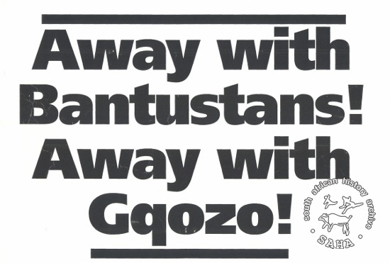 This poster is an offset litho in black. The text reads: "Away With Bantustans! : Away with Gqozo!". |