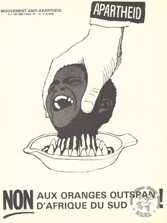 This is an offset litho poster in black. The image shows a hand labelled "APARTHEID" squeezing a black man's head on an orange juicer. The poster encourages a boycott of the Outspan Orange company and was issued by Mouvement Anti-Apartheid of France in solidarity with the people of South Africa during apartheid. The text reads: "MOUVEMENT ANTI-APARTHEID : B.P. 109 75463 PARIS 10e - Tel 47.70.29.09 : APARTHEID : NON AUX ORANGES OUTSPAN D'AFRIQUE DU SUD!" |