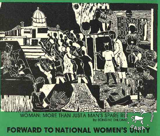 This poster is an offset litho in black and green. The text reads: "WOMAN: MORE THAT JUST A MAN'S SPARE RIB : BY BONGIWE DHLOMO FORWARD TO NATIONAL WOMEN'S UNITY".