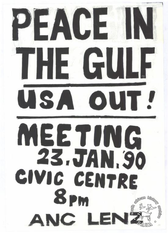 This is a silk screened poster in black and white issued by the ANC Lenasia Branch calling for a meeting in protest of the America soldiers in the Gulf |