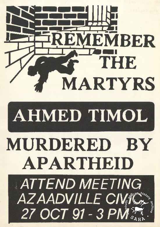 This silkscreened poster in black and white was issued by the Azaadville Civic in 1991. The text reads: "REMEMBER THE MARTYRS : AHMED TIMOL : MURDERED BY APARTHEID". This poster was digitised by Specialised Archival Solutions in 2009.