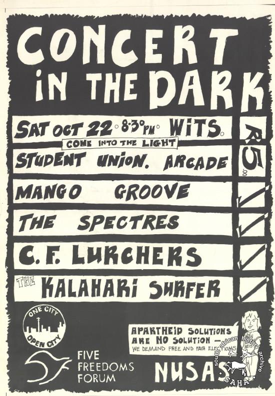 This is a silkscreened poster in black and white, issued by the National Union of South African Students (NUSAS) and the Five Freedoms Forum (FFF) for a 'Concert in the Dark' at the Student Union Arcade, Wits University on Saturday, 22 October, year unknown. The text reads: "CONCERT IN THE DARK : SAT OCT 22 : 8.30PM : WITS : STUDENT UNION ARCADE : MANGO GROOVE : THE SPECTRES : C.F. LURCHERS : KALAHARI SURFER : APARTHEID SOLUTIONS ARE NO SOLUTIONS : WE DEMAND FREE AND FAIR ELECTIONS". This poster was digitised by Specialised Archival Solutions in 2009. Included in the SAHA physical and virtual exhibitions 'What you won't hear on the radio' developed to mark the 30th birthday of Shifty Records and the 25th anniversary of the Voƫlvry tour. |