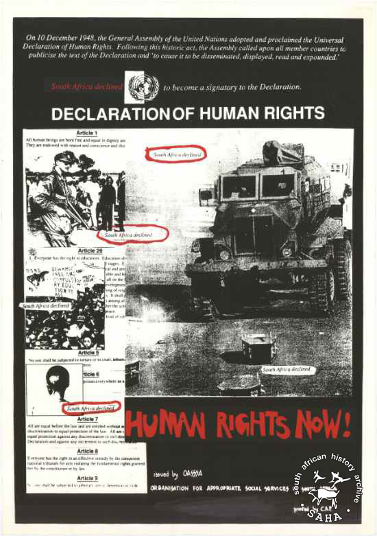 This is an offset litho poster in black, white and red. It was issued by Organisation for Appropriate Social Services in South Africa (OASSSA) and United Nations. |
