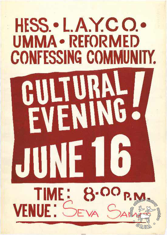 Silkscreened; red. The text reads: "HESS. • L.A.Y.C.O. • : UMMA • REFORMED : CONFESSING COMMUNITY. : CULTURAL : EVENING! : JUNE 16 : TIME: 8.00 P.M. : VENUE: SEVA SAMAJ".