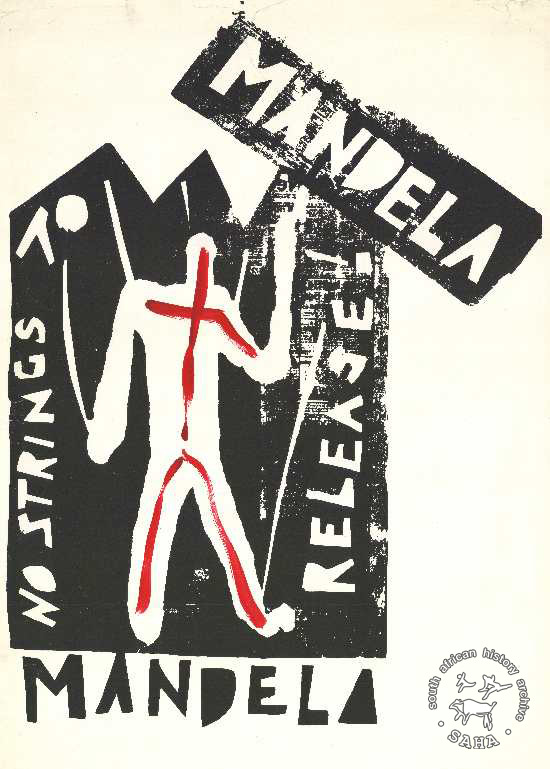 This is a silkscreened poster in black and red on white, source and date unknown. The text reads: "MANDELA: NO STRINGS TO RELEASE MANDELA." This poster was digitised by Specialised Archival Solutions in 2009. |