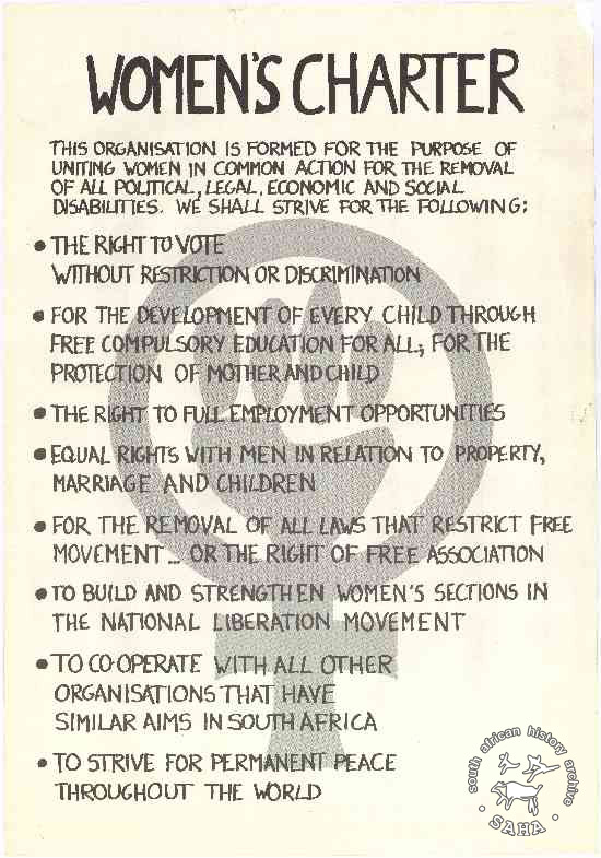 This poster is an offset litho in black. The headline text reads: "WOMEN'S CHARTER". The poster includes full text of the charter and a watermark of a logo of a fused woman symbol and a fist.