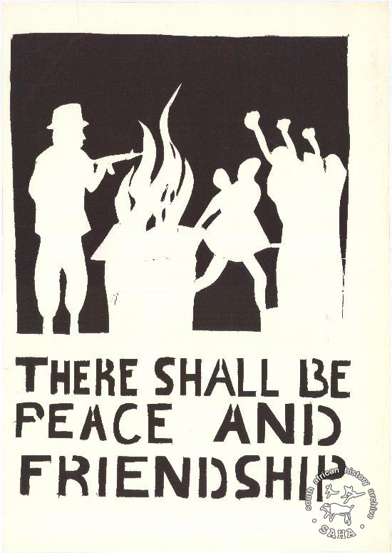 This poster is silkscreened black and white, produced by trainees at the Screen Training Project (STP) in 1985, Johannesburg. This poster refers to the tenth and final demand of the Freedom Charter.The text reads “ART TOWARD SOCIAL DEVELOPMENT”Digitised by Specialised Archival Solutions in 2009. Reproduced in "Images of Defiance: South African Resistance posters in the 1980s" on page 26 (number 35) of the 1991 SAHA / Ravan Press edition and the 2004 SAHA / STE Publishers edition. It also appears on page 91 of “Red on Black: The Story of the South African Poster Movement”, SAHA / STE Publishers, 2007 and in SAHA's online edition of the book and virtual exhibition 'Tracing the unbreakable thread: non-racialism in South Africa'. |