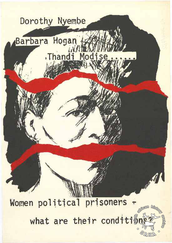 This poster is silkscreened in black and red. The poster features a drawing of a woman's face with two red lines running across it. The text reads: "Dorothy Nyembe : Barbara Hogan : Thandi Modise ...... : Women political prisoners : what are their conditions!".