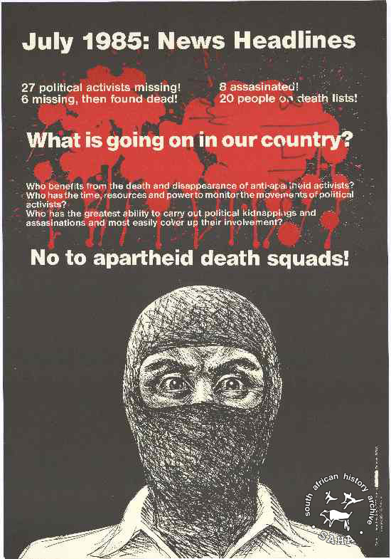July 1985: News Headlines : What is going on in our country? : No to apartheid death squads! |