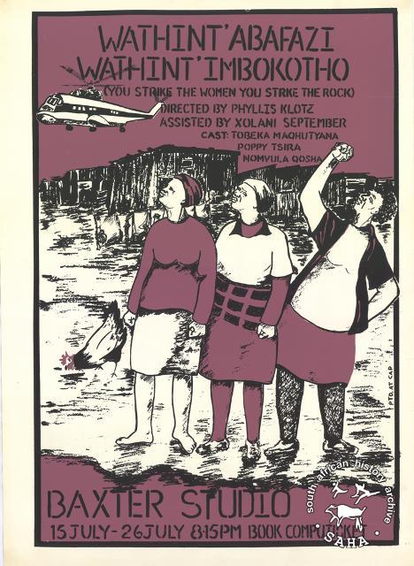 This is an offset litho poster produced by the Community Arts Project in Cape Town (CAP) for a theater production titled 'WATHINT' ABAFAZI WATHINT' IMBOKOTHO' (You strike the woman you strike the rock) at the Baxter Studio, dated 15-26 July, year unknown. This poster was digitised by Specialised Archival Solutions in 2009. Included in the SAHA exhibition kit 'Women Rise Up' and SAHA virtual exhibition 'Women hold up half the sky: commemorating women in the struggle'. |