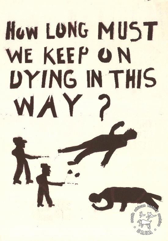 This poster is silkscreened red, produced at the STP. This poster depicts people crying out against apartheid murders. The text reads “HOW LONG MUST WE KEEP ON DYING IN THIS WAY ?”Digitised by Specialised Archival Solutions in 2009. Reproduced in "Images of Defiance: South African Resistance posters in the 1980s" on page 149 (number 271) of the 1991 SAHA / Ravan Press edition and the 2004 SAHA / STE Publishers edition. It also appears on page 152 of “Red on Black: The Story of the South African Poster Movement”, SAHA / STE Publishers, 2007 |