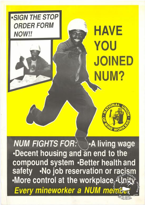 This poster is an offset litho in yellow and black, produced by the National Union of Mineworkers (NUM), Johannesburg. This poster relates to the National Union of Mineworkers (NUM) encouraging workers to join the union. The text reads “SIGN THE STOP ORDER FORM NOW : HAVE YOU JOINED NUM? : Every mineworker a NUM member” Digitised by Specialised Archival Solutions in 2009. Reproduced in "Images of Defiance: South African Resistance posters in the 1980s" on page 62 (number 109) of the 1991 SAHA / Ravan Press edition and the 2004 SAHA / STE Publishers edition. |