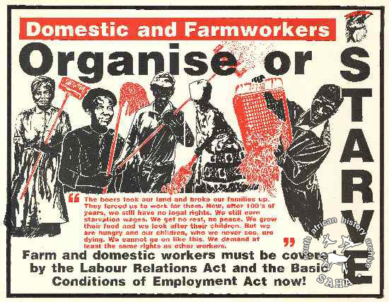This poster is an offset litho in black and red, produced by COSATU, Johannesburg. The text reads: "Domestic and Farmworkers : Organise or STARVE". Digitised by Specialised Archival Solutions in 2009. Reproduced in "Images of Defiance: South African Resistance posters in the 1980s" on page 60 (number 102) of the 1991 SAHA / Ravan Press edition and the 2004 SAHA / STE Publishers edition. It is also included in the SAHA virtual exhibition - 'Hlanganani Basebenzi: Commemorating South Africa's Labour Movement'. |
