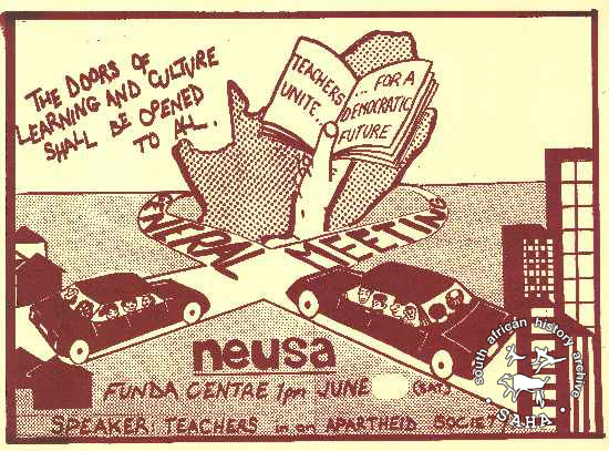 This poster deals with the general meeting of the teachers union NEUSA. |