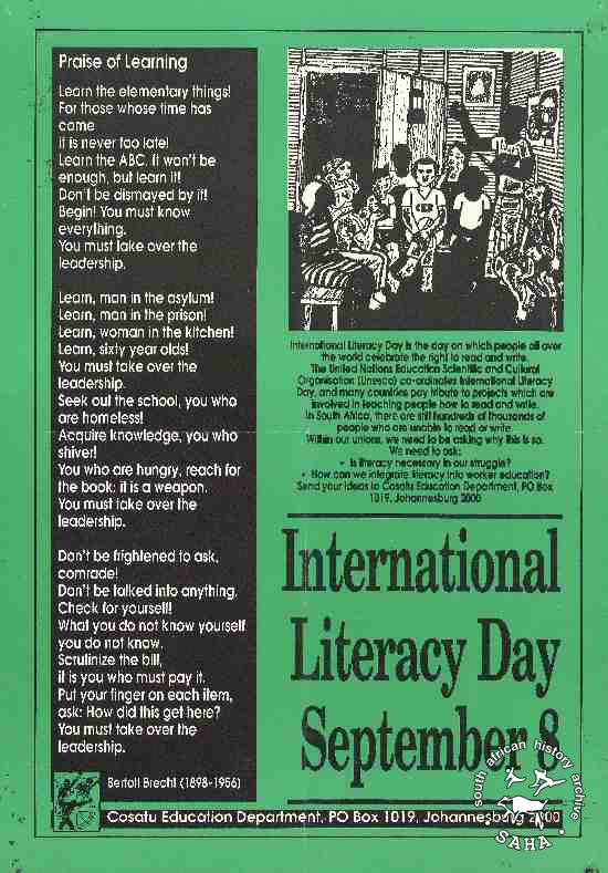 This poster is an offset litho in black and green, produced by TOPS and COSATU, Johannesburg. This poster publicises COSATU's participation in International Literacy Day.The text reads: "International Literacy Day September 8". Digitised by Specialised Archival Solutions in 2009. Reproduced in "Images of Defiance: South African Resistance posters in the 1980s" on page 60 (number 101) of the 1991 SAHA / Ravan Press edition and the 2004 SAHA / STE Publishers edition. |