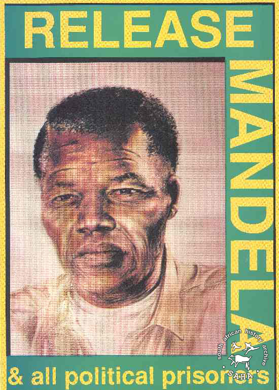 This poster is an offset litho in full colour, designed but not drawn by Marlene Powell and produced by COSATU. This portrait was painted from verbal descriptions by people who had visited Mandela in prison, as it is illegal to publish the photograph of a prisoner. The text reads “RELEASE MANDELA, & all political prisoners”Digitised by Specialised Archival Solutions in 2009. Reproduced in "Images of Defiance: South African Resistance posters in the 1980s" on page 22 (number 28) of the 1991 SAHA / Ravan Press edition and the 2004 SAHA / STE Publishers edition. It also appears on page 207 of “Red on Black: The Story of the South African Poster Movement”, SAHA / STE Publishers, 2007 |