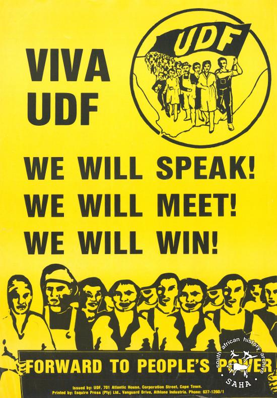 Offset litho poster in black on yellow was issued by the United Democratic Front (UDF), date unknown. The text reads: "VIVA UDF : WE WILL SPEAK! : WE WILL MEET! : WE WILL WIN! : FORWARD TO PEOPLE'S POWER". |