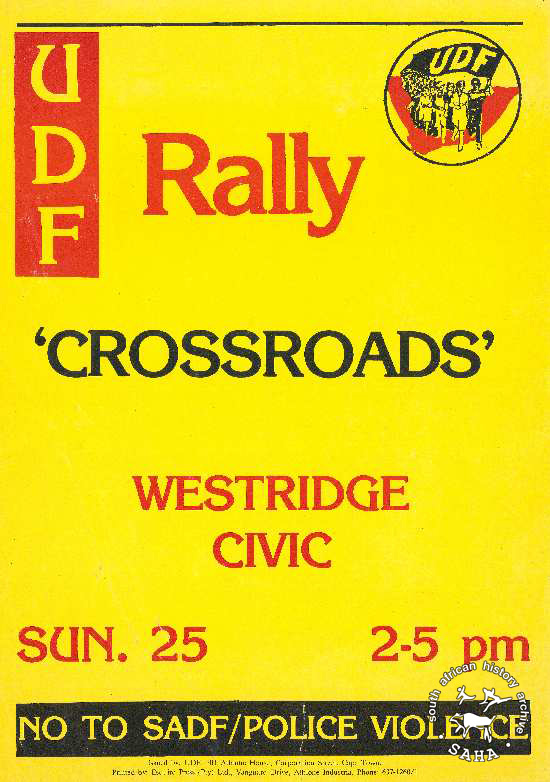 This poster deals with a UDF rally held in the Crossroads on the Cape Flats |