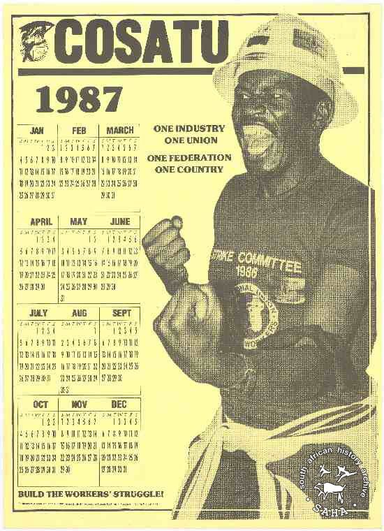 This poster is an offset litho in black. It also contains a calendar. The caption reads: "COSATU 1987 : ONE INDUSTRY ONE UNION : ONE FEDERATION ONE COUNTRY : BUILD THE WORKERS' STRUGGLE!". There are 4 copies; the copies are black on yellow.