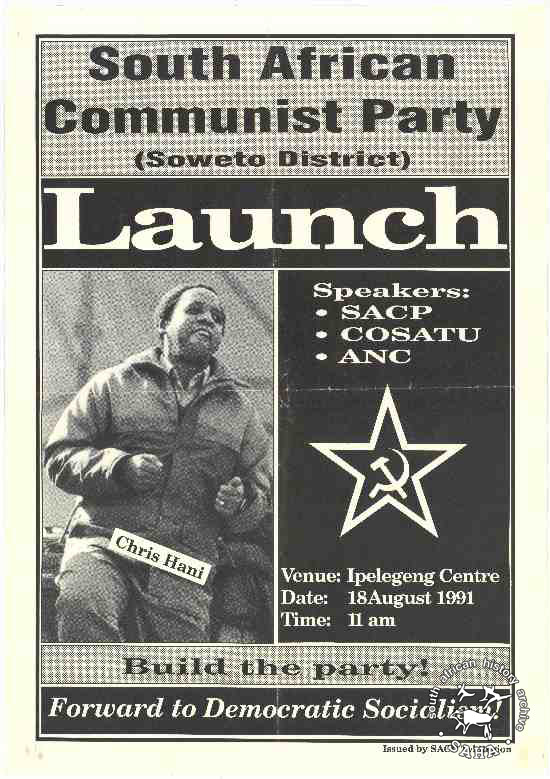 This poster is an offset litho in black on white. It includes a photograph of Chris Hani dancing. The text reads: "SOUTH AFRICAN COMMUNIST PARTY Soweto District Launch".