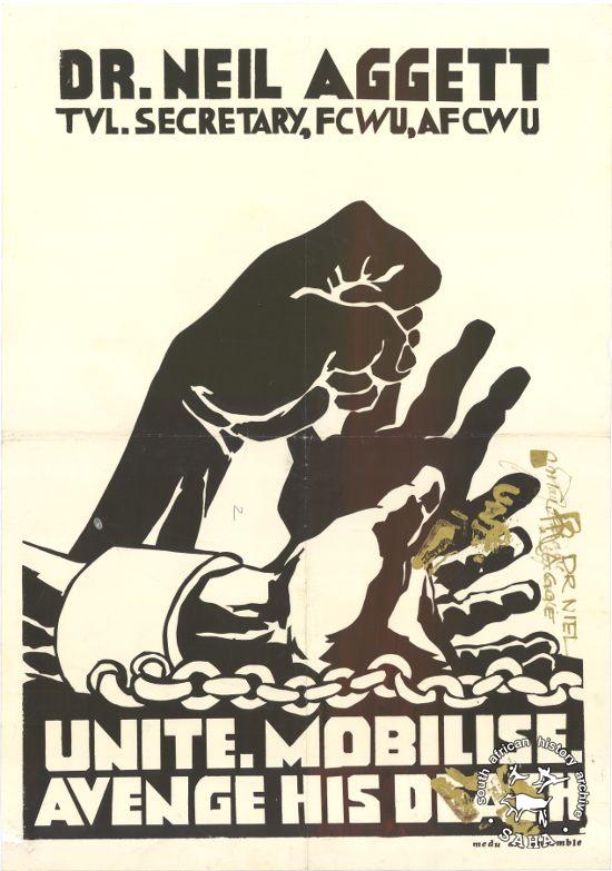 This silkscreened poster in black and red was produced by the Medu Art Ensemble. The text reads: "DR. NEIL AGGETT : TVL. SECRETARY, FCWU, AFCWU : UNITE. MOBILISE. AVENGE HIS DEATH". This poster was digitised by Specialised Archival Solutions in 2009.