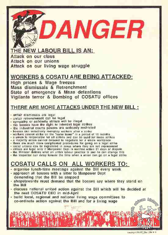 DANGER : THE NEW LABOUR BILL IS AN: : WORKERS & COSATU ARE BEING ATTACKED: :THERE ARE MORE ATTACKS UNDER THE NEW BILL: : COSATU CALLS ON ALL WORKERS TO: |