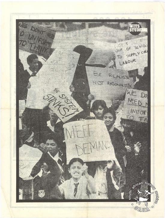 WE DONT NEED NO UNIFORM TO THINK : WITS STUDENT : THE SYSTEM STINKS! : BE REALISTIC NOT RATIONALISTIC : MEET DEMANDS 100,000 against the system : Johannesburg pupils initiate action |