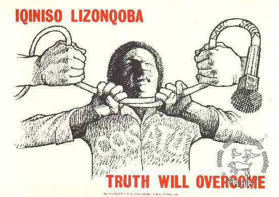 This poster is an offset litho in black and red, produced by COSATU. This poster illustrates the incapacitation of organisationd by the SABC;s biased reporting.The text reads: "IQINISO LIZONQOBA : TRUTH WILL OVERCOME". Digitised by Specialised Archival Solutions in 2009. Reproduced in "Images of Defiance: South African Resistance posters in the 1980s" on page 175 (number 321) of the 1991 SAHA / Ravan Press edition and the 2004 SAHA / STE Publishers edition. |