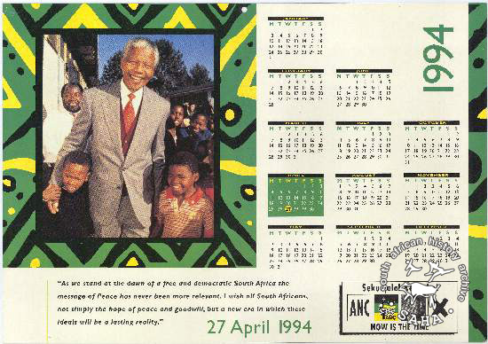 Offset litho; black, green and yellow; calendar; with picture of Nelson Mandela and children |
