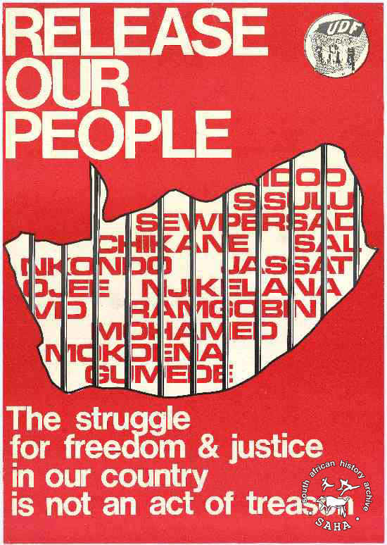 This offset litho poster in black and red was issued by the United Democratic Front (UDF), circa 1985. The text reads: "RELEASE OUR PEOPLE : The struggle for freedom & justice in our country is not an act of treason". This poster was digitised by Specialised Archival Solutions in 2009.