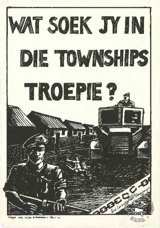 This poster is silkscreened black, produced by the ECC, Johannesburg. This poster questions the existence of the soldiers in townships. The text reads “WAT SOEK JY IN DIE TOWNSHIPS TROEPIE?” Digitised by Specialised Archival Solutions in 2009. Reproduced in "Images of Defiance: South African Resistance posters in the 1980s" on page 135 (number 240) of the 1991 SAHA / Ravan Press edition and the 2004 SAHA / STE Publishers edition. It also appears on page 148 of “Red on Black: The Story of the South African Poster Movement”, SAHA / STE Publishers, 2007 |