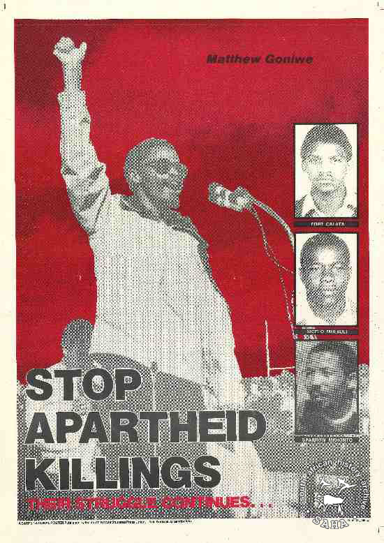 STOP APARTHEID KILLINGS : THEIR STRUGGLE CONTINUES... : MATTHEW GONIWE : FORT CALATA : SICELO MHLAULI : SPARROW MKHONTO |