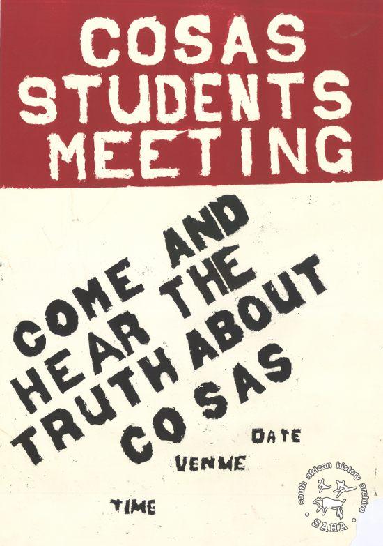 This silkscreened poster in black and red was issued by the Congress of South African Students (COSAS) and the text reads: "COSAS STUDENTS MEETING : COME AND HEAR THE TRUTH ABOUT COSAS". This poster was digitised by Specialised Archival Solutions in 2009.