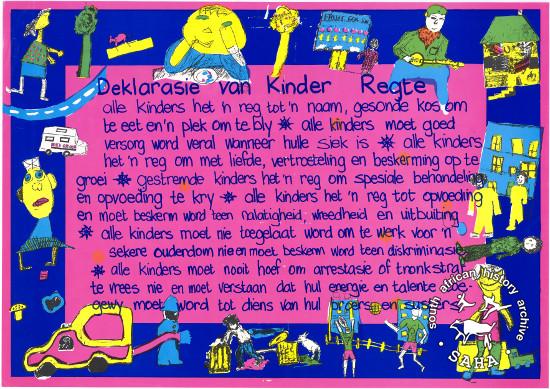 This poster is an offset litho in pink, blue, green and yellow, produced by Molo Songololo, a children’s magazine, Cape Town. This poster depicts the Afrikaans version of the International Declaration of Children’s Rights, which was printed at a time when hundreds of children were in detention. The text reads: “Deklarasie van Kinder Regte" Digitised by Specialised Archival Solutions in 2009. Reproduced in "Images of Defiance: South African Resistance posters in the 1980s" on page 90 (number 162) of the 1991 SAHA / Ravan Press edition and the 2004 SAHA / STE Publishers edition |