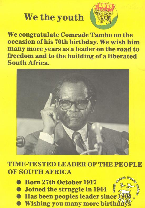 This poster is an offset litho in black, red, yellow and green, produced for South African Youth Congress (SAYCO) by Graphic Equalizer, Johannesburg. The poster which includes a picture of Oliver Tambo relates to SAYCO celebrating the 70th birthday of Oliver Tambo, who was the then exiled president of the ANC. The text reads “We the youth”. Digitised by Specialised Archival Solutions in 2009. Reproduced in "Images of Defiance: South African Resistance posters in the 1980s" on page 18 (number 20) of the 1991 SAHA / Ravan Press edition and the 2004 SAHA / STE Publishers edition. |
