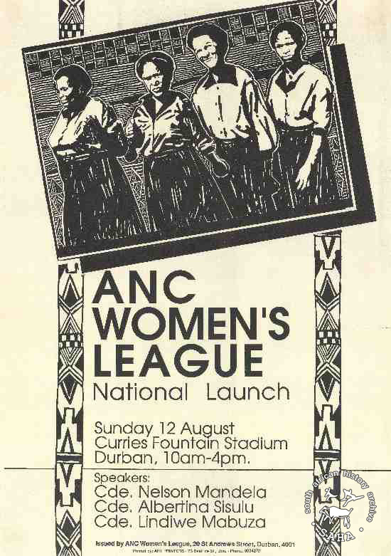 This poster is an offset litho in black and white. The poster includes a photograph of four women (the photograph has been manipulated to look like a drawing). The text reads: "ANC : WOMEN'S : LEAGUE : National Launch : Sunday 12 August : Curries Fountain Stadium : Durban, 10am-4pm : Speakers: : Cde Nelson Mandela : Cde Albertine Sisulu : Cde Lindiwe Mabuza : Issued by ANC Women's League, 20 St Andrews Street, Durban, 4001 : Printed by ART PRINTERS - 73 Beatrice St., Dbn. - Phone: 3094272".