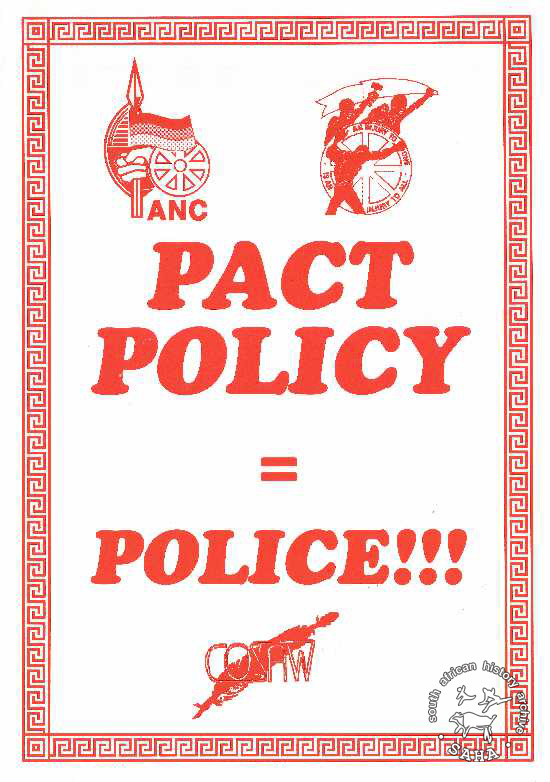 This poster is an offset litho in red. The caption reads: "PACT POLICY = POLICE!!!". |