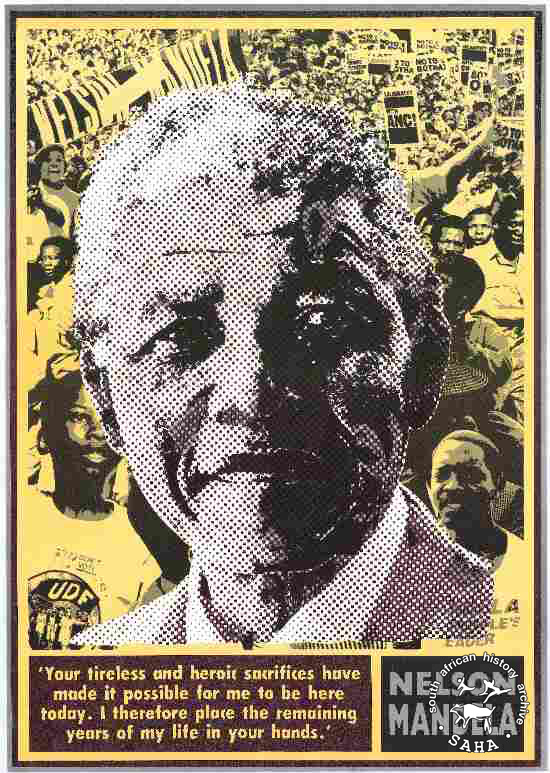This offset litho poster in brown and black on yellow was issued by the United Democratic Front (UDF) in 1990 and the caption reads: "'Your tireless and heroic sacrifices have made it possible for me to be here today. I therefore place the remaining years of my life in your hands.' NELSON MANDELA". This poster was digitised by Specialised Archival Solutions in 2009. |