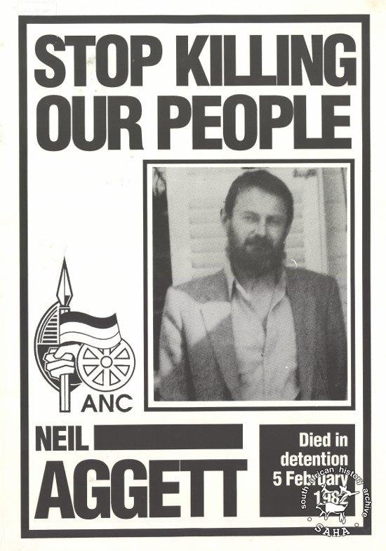 This offset litho poster in black and white was issued by the African National Congress (ANC), date unknown. The text reads: "STOP KILLING OUR PEOPLE : NEIL AGGETT : Died in detention 5 February 1982". This poster was digitised by Specialised Archival Solutions in 2009.