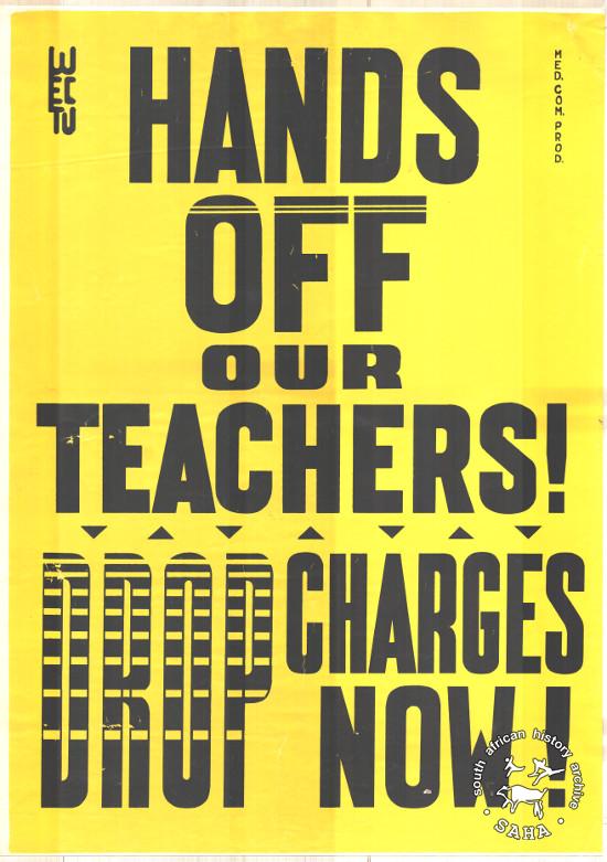 This poster is silkscreened black and yellow, produced by WECTU in 1986, Cape Town. This poster refers to the teachers' union demanding that the state stop harassment of teachers. The text reads “HANDS OFF OUR TEACHERS!: DROP CHARGES NOW!” Digitised by Specialised Archival Solutions in 2009. Reproduced in "Images of Defiance: South African Resistance posters in the 1980s" on page 121 (number 221) of the 1991 SAHA / Ravan Press edition. |