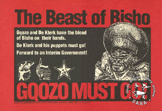 This poster is an offset litho in black and red. The caption reads: "The Beast of Bisho : GQOZO MUST GO!". |