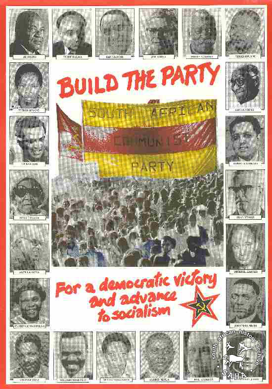 This poster is an offset litho in black, red and yellow. It features a photograph of a rally bordered with individual portraits of Communist Party cadres. It also features the SACP logo. The text reads: "BUILD THE PARTY : For a democratic victory and advance to socialism".
