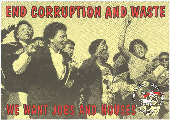 This poster is an offset litho in black and red on yellow. The caption reads: "END CORRUPTION AND WASTE : WE WANT JOBS AND HOUSES".