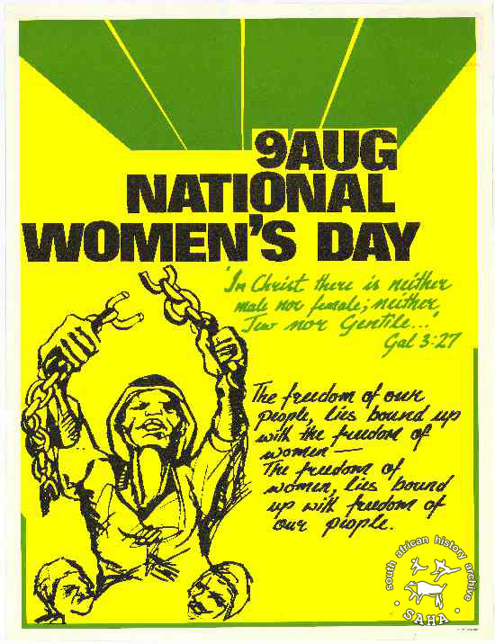 This poster is an offset litho in black, green and yellow. It features a drawing of a woman breaking a chain while two other women look on. The text reads: "9 AUG : NATIONAL : WOMEN'S DAY : In Christ there is neither male nor female; neither Jew nor Gentile... : Gal 3:27 : The freedom of our people, lies bound up with the freedom of women -- The freedom of women lies bound up with the freedom of our people.".