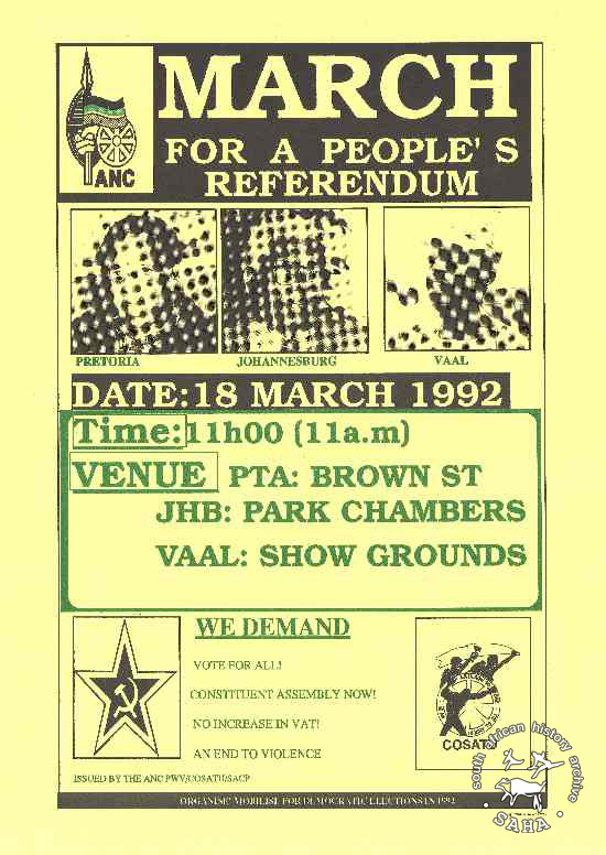 This poster is an offset litho in black and green on yellow. It features photographs of the march leaders. The caption reads: "MARCH FOR A PEOPLE'S REFERENDUM". |