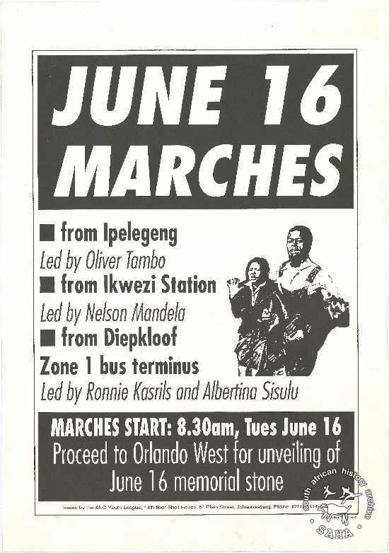 This poster is an offset litho in black as issued by the African National Congress Youth League (ANCYL) in 1992. Features an image of Hector Pieterson. The text reads, in full: "JUNE 16 : MARCHES : • from Ipelegeng : Led by Oliver Tambo : • from Ikwezi Station : Led by Nelson Mandela : • from Diepkloof : Zone 1 bus terminus : Led by Ronnie Kasrils and Albertina Sisulu : MARCHES START: 8.30 am, Tues June 16 : Proceed to Orlando West for unveiling of : June 16 memorial stone : Issued by the ANC Youth League, 14th floor Shell House, 51 Plein Street, Johannesburg. Phone: (011)333-675019 : Taj Printers 422-317213".
