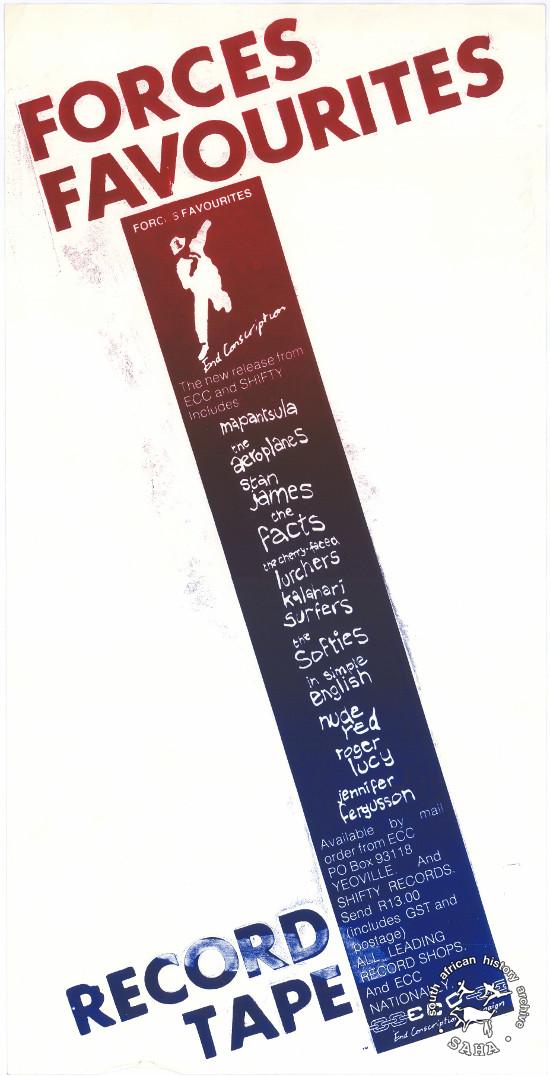 This is an offset litho poster in blue and red, issued by the End Conscription Campaign (ECC) for the release of the compilation album 'Forces Favourites' in conjunction with Shifty Records in 1985. The text reads: "The new release from ECC and SHIFTY includes: mapantsula : the aeroplanes : stan james : the facts : the cherry-faced lurchers : kalahari surfers : the softies : in simple english : nude red : roger lucy : jennifer fergusson : RECORD TAPE". This poster was digitised by Specialised Archival Solutions in 2009. Included in the SAHA physical and virtual exhibitions 'What you won't hear on the radio' developed to mark the 30th birthday of Shifty Records and the 25th anniversary of the Voƫlvry tour. |