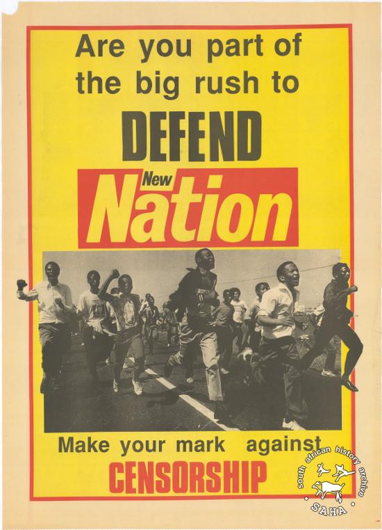 This poster is an offset litho in black, red and yellow, produced by the New Nation, Johannesburg. This billboard poster called for opposition to censorship and support for the New Nation, which was a progressive newspaper muzzled by the state. The text reads: “Are you part of the big rush to DEFEND New Nation : Make your mark against CENSORSHIP” on page 174 (number 318) of the 1991 SAHA / Ravan Press edition and the 2004 SAHA / STE Publishers edition. |